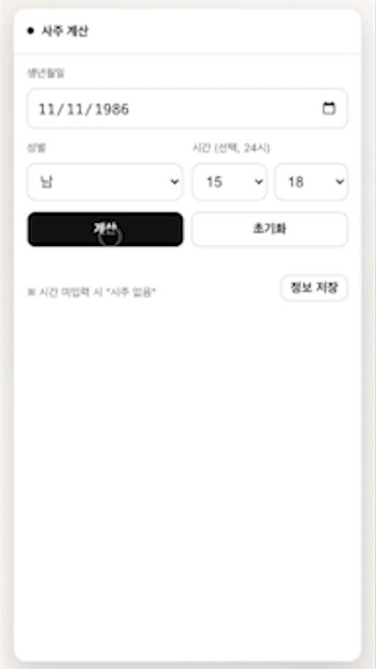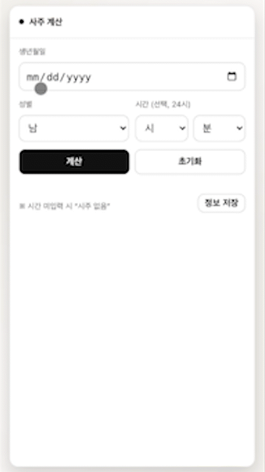 - 일주(日柱): 입력하신 생년월일을 KST로 해석하고, 해당 날의 로컬 정오 기준으로 만세력 일간지를 산출합니다.