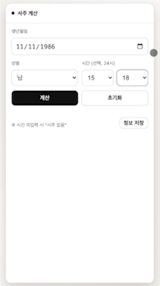 - 시차·태양시: 한국에서 널리 쓰는 방식으로, 입력 시각(KST)에서 30분을 감산한 시각을 일주·시주·야자시 판단에 반영합니다. (경도에 따른 이론값은 약 32분에 가깝지만, 보편적으로 30분을 사용합니다.)